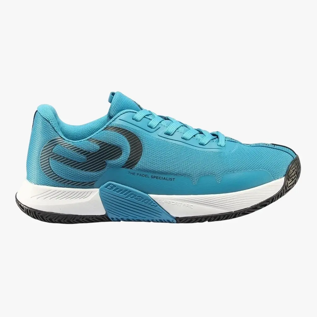 Suela híbrida: Bullpadel utiliza una suela especial que combina dos patrones. Una parte tiene el clásico diseño de espiga (o "clay"), que ofrece un agarre excepcional en superficies de arena. La otra parte tiene pequeños tacos circulares llamados "Sole Dots", que mejoran la tracción y la versatilidad en distintos tipos de pista. Esta combinación te da un control total en los movimientos y los cambios de dirección rápidos.